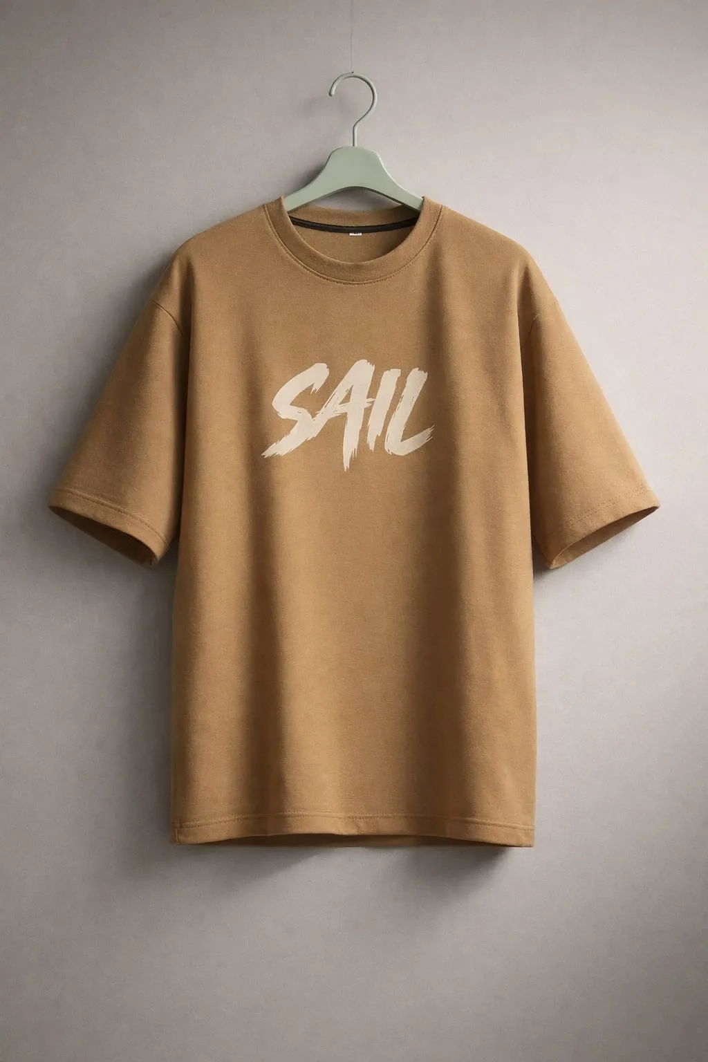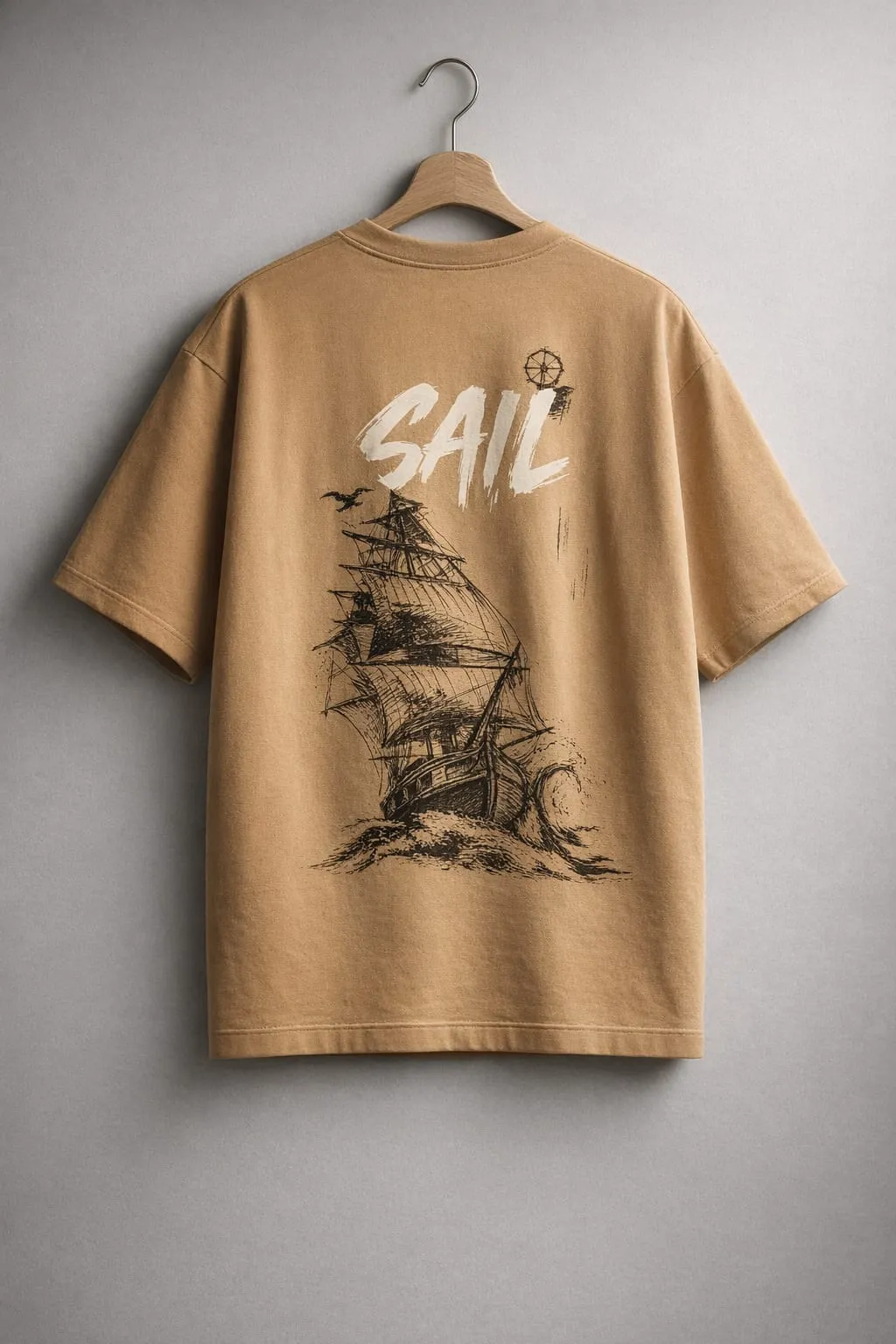 The back features a detailed sail ship graphic with “SAIL” typography, giving a calm yet adventurous aesthetic. The neutral beige tone adds a premium and versatile look, perfect for casual and streetwear styling.