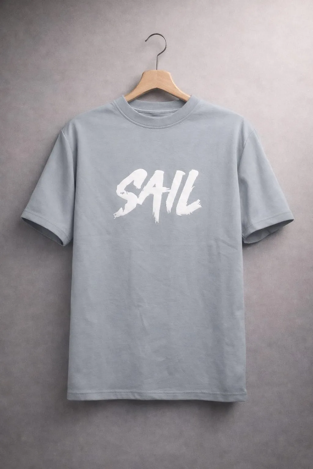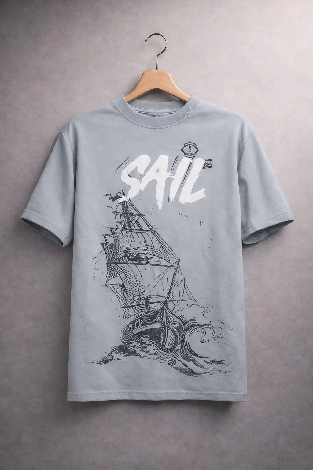 The front showcases a clean “SAIL” typography, while the detailed sailing ship artwork adds a calm, adventurous aesthetic. The light grey shade gives a modern, premium look that pairs easily with any outfit.